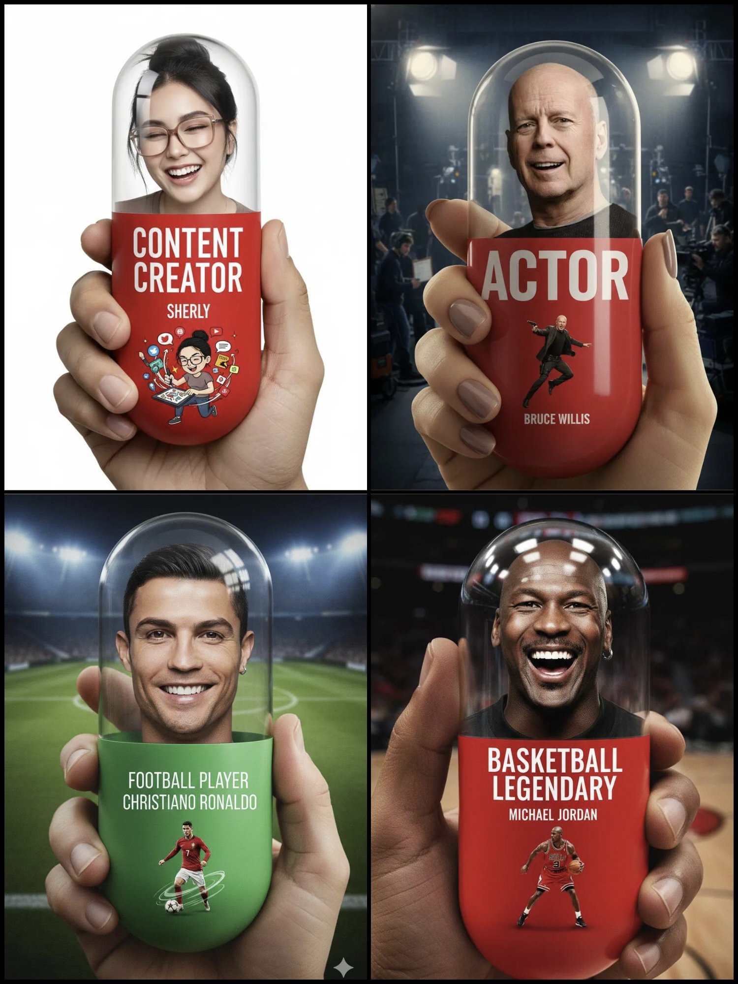 Extreme close-up of a human hand holding a giant vertical pill. The pill has a clear glass top section and the lower 3/4 is matte bright-red, with bold, clean, perfectly aligned typography that reads: BASKETBALL LEGENDARY. Inside the pill, show a person whose face must match the attached photo 100% exactly — no changes to facial structure, proportions, expression baseline, or any detail. The face must display a natural, realistic, wide laughing expression. Inside the pill, the person is performing a dynamic basketball dribbling pose with high energy, labeled with the account name 'MICHAEL JORDAN'. Scene style: funny, chaotic, thrilling, slightly creepy, and intense. Background: an NBA basketball court, with full cinematic lighting, dramatic shadows, and rich color depth. Camera angle: aerial extreme close-up focused on the pill in the hand. Texture: ultra-HD realism with fine grain, crisp micro-details, glass reflections, and smooth matte material fidelity. Ratio 3:4. Ensure motion, energy, and dynamic movement inside the pill while keeping the pill perfectly vertical.