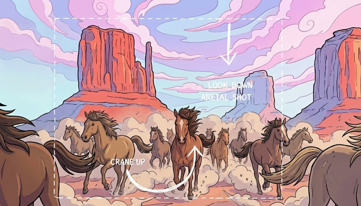 add sketch annotations on top of this image explaining the camera movement. I want it to crane up and the look down as an aerial shot