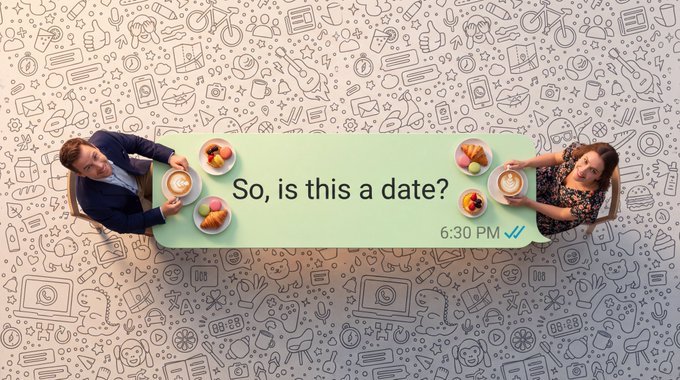 超写実俯瞰マクロ写真。細長い薄緑色のWhatsAppダイアログボックスが食卓として機能している。二人の実在人物(極小サイズに縮小)がテーブルの両端に座っている。彼らはプラスチック人形ではなく、はっきりと見える肌の質感、自然な髪の毛、リアルな衣服のシワを持っている。彼らは粘土細工ではなく、新鮮に調理された本物の食べ物を楽しんでいる。ダイアログ内のテキストは「テキストを挿入」と表示されている。右下隅にはタイムスタンプ「午後3:33」と青色のチェックマークが表示されている。背景は完全に高密度でシームレスなWhatsAppの落書き模様(ラインアートアイコン)で覆われており、隙間はなく、オリジナルのWhatsAppの密集した壁紙のようである。プロフェッショナルなスタジオ照明、8K解像度、鮮明な焦点。